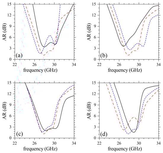 To understand how different design parameters affect the functioning of the meta-antenna, we plotted and AR for different values of , , ls and in Figure 7 and Figure 8. There is a slight narrowing of the impedance bandwidth for increasing in Figure 7a, in contrast with the loss of CP radiation () in Figure 8a. This dependence of AR on highlights the importance of this parameter when designing the metasurface to obtain high-performance CP radiation. Upon increasing the modes in are discretized with loss in the ability to generate CP radiation as indicated by the poor AR values () in Figure 8b. The latter behavior is explained by recalling that the CDM modes should be matched with the two orthogonal modes from the driven patch for a proper coupling and field re-radiation. Another important parameter in the design is the length of the slots, which can be varied to tune AR (and its bandwidth) to its optimum values with small changes of , as noted in Figure 7c and Figure 8c. The interaction of nearby cylinders in CDM depends on which then affects the quality of CP radiation. Figure 7d and Figure 8d point to a decrease in the ability to produce CP mm-waves upon increasing . Excitation of several out-of-phase resonances occurs for very small which despite widening the impedance bandwidth, negatively affect AR.