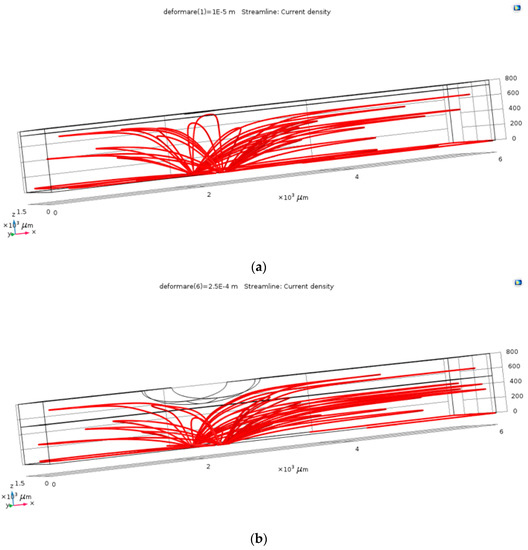 | Channel’s Deformation (μm) | Initial Version | Electrodes Width 1000 μm | Electrolyte Conductivity 4 mS/cm | Channel Height 500 μm | ||||