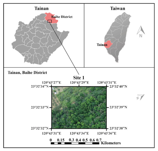 In 2002, there were 17 species of trees planted in Taiwan and the area of hardwood forest was 188.59 hectares [4]. The 17 species included the tropical species “Swietenia macrophylla” in the south of Taiwan, which experiences defoliation for one to two weeks during the middle to late March. New leaves grow rapidly within one to two days and are observable in the air. This study used an eBee Real-Time Kinematic (RTK) drone (developed by SenseFly, Switzerland) carrying a Canon PowerShot S110 camera flying at an altitude of 239.2 ft of the area on 12 July 2014 under very good weather condition. The weather is generally hot and humid. The mean annual temperature is 24.38 °C. Leaf development is a process of dynamic plant growth responding to plant physiology and environmental signals [79]. Leaves start to develop from the apical meristems of branches. It is unachievable to visualize a newly sprouted leaflet from the UAV at the initiation stage of the life cycle of a leaf. However, after a period of gradual development, the newly grown leaf is normally at a size of a centimeter and can be visualized from a distance. July is a good time to fly a UAV to detect newly grown leaves in the south of Taiwan. The spatial resolution of the ground sample distance of the images was 6.75 cm (known as a centimeter-level very high resolution (VHR) image). The research site was located in the Baihe District of Tainan City, Taiwan (23°20′ N, 120°27′ E) as shown in Figure 1. This image includes the red, green, and blue bands, with a dimension of 1000 × 1300 pixels and the actual area of the full image is 60 m × 78 m.