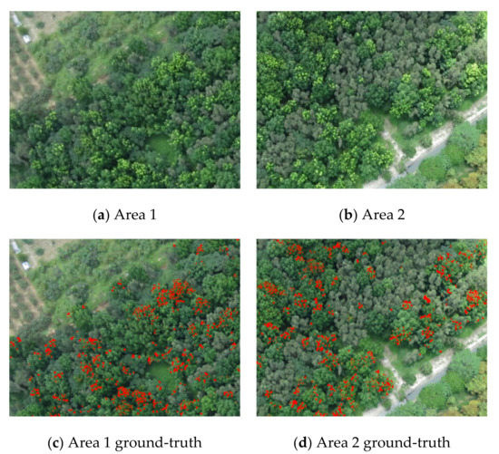 In 2008, a few permanent plots were deployed over the broadleaf forest for research of forest growth [80,81], where a series of ground inventory is annually conducted for stand dynamics [17]. The data have been successfully derived using the forest canopy height model [82] and have investigated the feasibility of global/local target detection algorithms for the detection of NGL by our prior studies [4,76,78]. As shown in Figure 2a,b, the NGLs can be visually inspected by experts due to their appearance. They are bright, light green, and amassed over the tree crowns. According to a row of several years of inventory, the ground truth of the NGL over the images was visually interpreted by two professors from the Department of Forestry at National Chiayi University, Taiwan, and was also validated in situ. To quantify and compare the effects of different algorithms, there must be an NGL detection map as the ground truth of Area 1 and Area 2, as shown in Figure 2c,d. The NGL is only about 3–4% of the entire images.