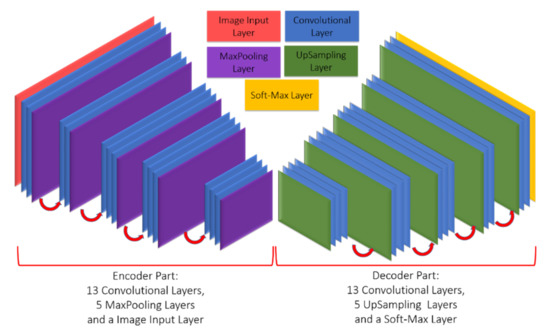 - Badrinarayanan, V.; Kendall, A.; Cipolla, R. SegNet: A Deep Convolutional Encoder-Decoder Architecture for Image Segmentation. IEEE Trans. Pattern Anal. Mach. Intell. 2017, 39, 2481–2495. [Google Scholar] [CrossRef]