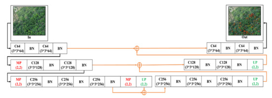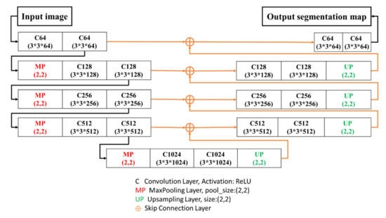 Afterward, based on the 3-Layer SegNet network model, the skip connection (SC) of U-Net was imported. This concept was proposed by P. Kumar et al. [65] and Daimary D. et al. [89]. This paper differs in that the skip connection was applied after SegNet pooling depth was reduced by two layers. The purpose of this architecture was to enhance the spatial information of the sample in the course of up-sampling, to enhance the detection capability. Figure 6 shows the 3-Layer skip-connection SegNet network architecture.