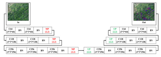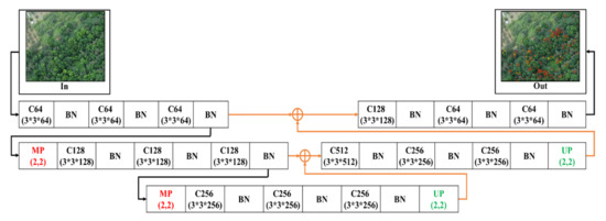 The classical SegNet model was used as the main skeleton of the model. The original SegNet model has more pooling times. The low-level features of tiny targets will blur or even disappear. Therefore, the number of pooling layers was reduced at first. To increase the detection rate, the model could be downsized on the other hand and the loss of tiny targets could be reduced while maintaining the accuracy. When the skip connection (SC) of U-Net was used, the spatial information of the same level was connected upward in the up-sampling process on the bottom layer, and then convolution of the up-sampling was performed. Finally, the batch normalization was added to each convolutional layer [88] to guarantee data stability.