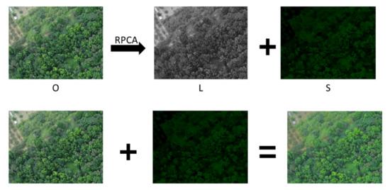 To enhance the efficiency of the deep learning network for NGL detection, this study proposed a processing method based on Robust Principal Component Analysis (RPCA) [67,68,69,90,91,92], and to perform image enhancement for the probable NGL areas in the forest image in advance. The SegNet deep learning network was trained and tested by an enhanced image. RPCA could separate the sparse matrix and low-rank matrix from the input image (regarded as a matrix). RPCA is usually used in image recognition and dimension reduction based on high dimensional data, and it performs linear conversion of the original data by calculating the maximum feature vector. The general data matrix contains the main structural information and probable slight noise information. RPCA decomposes the input matrix into two matrices which are added up; one is a low-rank matrix (including the main structural information) in which the columns or rows are linearly correlated. The other is a sparse matrix (including noise information), expressed as Equation (4):