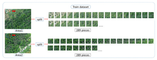 The training images were generated by sliding windows, and the window size was 260 × 200. To increase the training data volume, the original image was segmented and slid rightwards for only 65 pixels (red window moving rightwards to the cyan window in Figure 10). When it slid to the edge, the window would move down 50 pixels and then slide to the left edge. These actions were repeated until the complete image is captured. There were 289 images split from the image as training data, and each image was 260 × 200. Figure 11 shows the training data generation of Area 1 and Area 2.