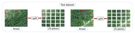The sliding window split method is also used for the testing data, and the window size was 200 × 260. Differing from the training data which slid rightwards only for 65 pixels, the test data slid rightwards 260 pixels at a time to avoid image overlap during the test (the red window moving to the cyan window in Figure 11). When the window slid to the edge, it would move down 200 pixels and then return to the left edge. The aforesaid action was repeated until the complete image was captured. There were 25 images split from the test data, and each image was 260 × 200. Figure 11 shows the test data splitting flowchart of Area 1 and Area 2.