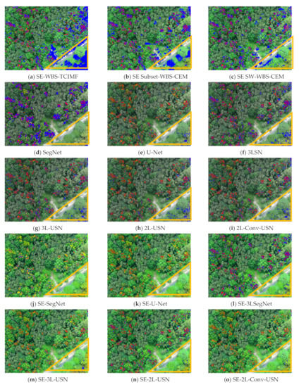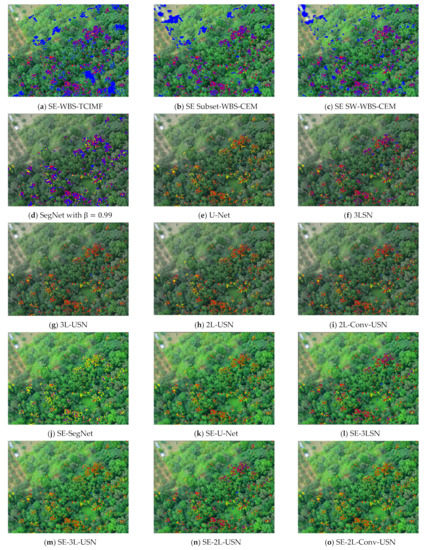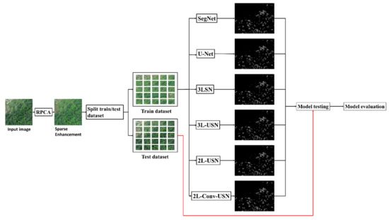 In prior studies about NGL, Lin et al. [4] first investigated the hyperspectral target detection algorithms for the possibility of detecting NGL by using spectral information in active and passive manners. However, target detection algorithms were sensitive to the desired target in the final results. After that, Chen et al. [76] proposed the Optimal Signature Generation Process (OSGP) and adaptive window-based Constrained Energy Minimization (CEM) [77], which could provide steadier detection results and reduce the occurrence of false alarms. Another method is based on data preprocessing, in which the target of detection is enhanced by data preprocessing. Chen et al. [78] used preprocessing to enhance the signal of NGL and adopted the Weighted CEM to further reduce the misrecognition rate in the detection results. Differing from prior documents in terms of target detection point of view, this paper started with the segmentation of deep learning application which achieves pixel-level prediction by classifying each pixel according to its category and dividing the image into foreground and background for binary classification and target detection as previous studies. This paper combined hybrid models with U-NET and SegNet, reducing the number of pooling layers to keep the information of NGL and using skip connection to extract feature information from low-level information in the hopes of enhancing NGL features. Moreover, this paper used sparse enhancement preprocessing before the network architecture of deep learning. As the area of NGL to be detected in the forest image had sparse-like characteristics compared to the full image, the NGL in the original image was enhanced by this method. So, the goal of this paper is to investigate the possibility of hybrid deep learning architectures for the detection of NGL from UAV images and the performance of using sparse enhancement (SE) technique as preprocessing in our proposed models.