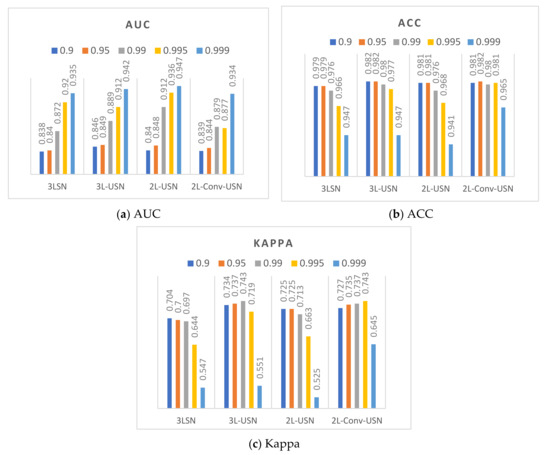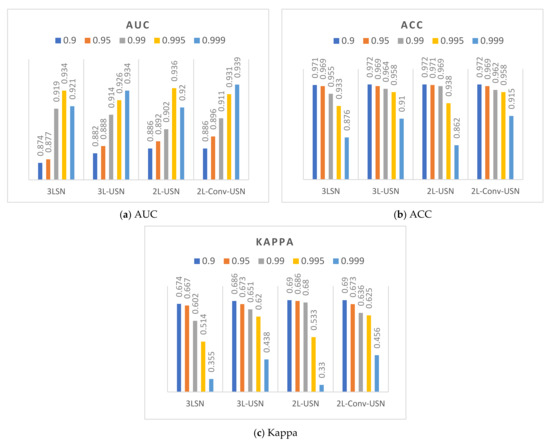 This section discusses the data difference in the extended model proposed in this paper when the hyperparameter of Loss function BCE is different, and the performance of each model is calculated and evaluated. This paper used ROC, ACC, and Kappa as the criteria of the evaluation score, because the effects of hyperparameter on AUC and Kappa were compared. Figure 14 and Figure 15 only show the data of the flip-SPCP-max-QN kernel corresponding to different hyperparameter of . According to the data drawing list of Area 1, the models had better performance when , and various models had smaller differences when , but the Kappa is lower. The performance of in AUC was only a few percentage points different from , but the Kappa had a good performance in the two areas; therefore, was selected as the parameter in subsequent experiments.