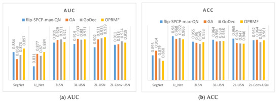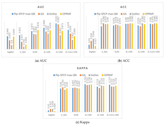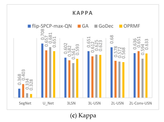 This section combines the SE preprocessed by RPCA with different kernels with the SegNet and U-Net of the BCE lost function and the proposed models used in the previous sections using Area 1 and Area 2. To review the differences among different kernels after preprocessing, the data in the previous section were sequenced according to AUC, true positive rate (TPR), FPR, and Kappa to compile a line chart, as shown in Figure 16 and Figure 17. According to the data drawing list of Area 1, the flip-SPCP-max-QN had better performance in detection (TPR) but had a larger increase in the amplitude of the misrecognition rate (FPR); therefore, its Kappa value was influenced greatly. With the GoDec method, the false alarm rate is relatively low, but the detection rate was also relatively low. To sum up, OPRMF had a relatively average performance in detection. In terms of Area 2, the GoDec kernel could not inhibit the background well, and the other three kernels had similar detection effects.