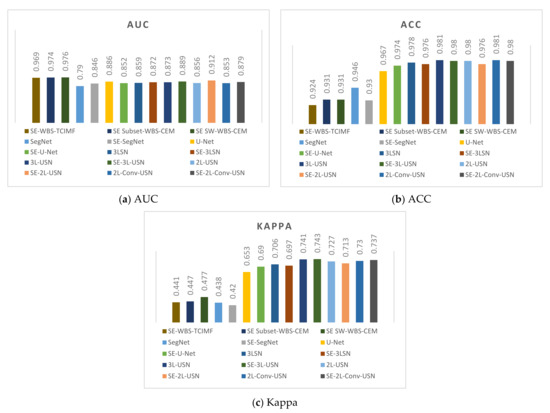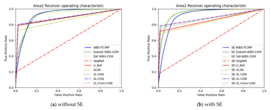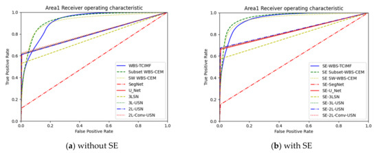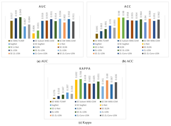 Two methods for evaluating accuracy were used in this paper. The first one was receiver operating characteristic (ROC) [97] analysis, which has recently received considerable interest in a wide range of applications in signal processing and medical diagnosis. To evaluate the detection performance of a ROC analysis, which makes use of a curve plotted as a function of detection probability, PD or True Positive, TP versus false alarm probability, PF or False Positive, FP are commonly used to assess the effectiveness of a detector. As an alternative to the use of ROC curves, the area under the curve (AUC), which has been widely used in medical diagnosis, was also calculated by the area under the ROC curve. Another method Cohen’s kappa coefficient (Kappa) [98] can measure the consistency between two classes. In image processing, the ROC curve is used to measure the effectiveness of the detector. Cohen’s kappa is an algorithm that evaluates the results of binarization and calculates consistency.