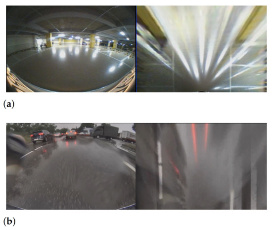 Examples of specularity in top-view images: (a) indoor parking lot and (b) outdoors on a wet road. The left image is the raw image and the right image is the top-view image.