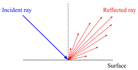From a macroscopic point of view, there are two terms used to describe reflection: specular or diffuse. Specular reflection means that the light rays reflect at the same angle as the angle of incidence, whereas diffuse reflection means that the light rays scatter equally in every direction. In real-world situations, both types are ideal and rarely happen in isolation. Reflections from most existing materials have mixed characteristics, being neither completely specular nor completely diffuse. Phong [36] empirically modeled reflections using specular and diffuse terms. According to the model, a reflection from a glossy surface such as a wet road or a floor coated with the epoxy or concrete, which is slightly rough at a microscopic level, is very close to the specular reflection but has a small amount of scattering (Figure 2).