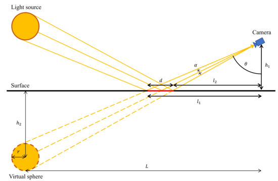 Since specularity caused by this reflection produces a striking effect in the image, many researchers have tried to detect and remove this effect, as mentioned in Section 2. However, there is a limitation to what can be achieved. Using only the color properties of the reflection, objects with a color similar to that of the specular region cannot be distinguished. To solve this problem, we handle specularity from a geometric point of view, considering the JOLIMAS model, in which the shape of the specularity based on Phong’s model is analyzed. In the JOLIMAS model, the shape of the specular region is an orthogonal projection of a virtual sphere located at a point symmetrical to the light source relative to the ground (Figure 3), in which a conic section generally forms. The major axis of the specular region can be calculated as
