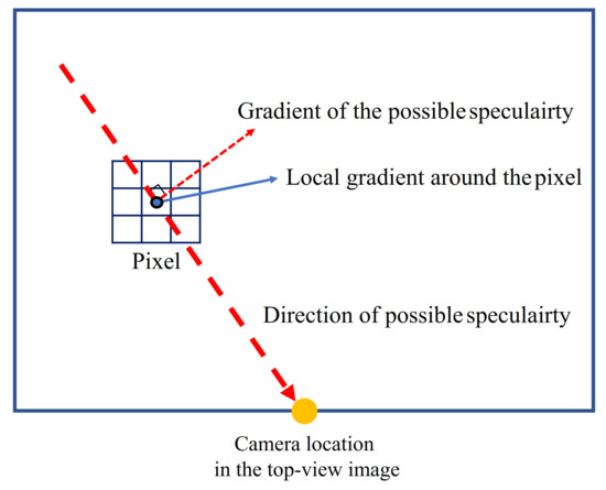 Because the intensity values and profiles of the lines and specular regions are very similar, the latter can induce false line detection results. The specularity inducing the false line detection has a linear shape due to a long distance between the camera and light source. According to the geometric property discussed in Section 3.1, its orientation is directed toward a camera location in the top-view image. Since the camera location in the top-view image can be obtained during the extrinsic calibration process to define a geometric relationship between the camera and ground plane, we do not need an additional step to acquire the camera location in the top-view image. Therefore, we can predict all possible stretched directions of the specularity at a certain pixel. This is an important clue to distinguish specular pixels and non-specular pixels. If a pixel is specular, a local gradient around the pixel should be similar to the gradient of the possible specularity. These two gradients can be obtained using intensity changes of adjacent pixels and direction of the possible specularity as depicted in Figure 4.