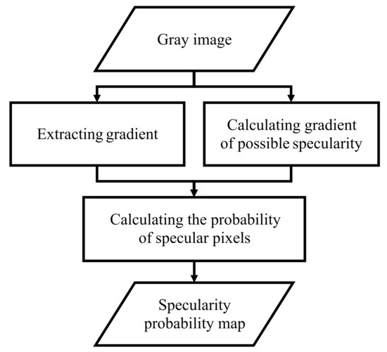 Due to the quantization error caused by the process of generating top-view images and the non-spherical shape of the light source, it is difficult to determine specular pixels discretely. Therefore, a probability map indicating pixel-wise probability that a pixel is specular is generated to fill this gap. The information from the probability map is then used to suppress specular pixels. There can be many possible applications using this map to suppress specular pixels. As an example, we describe how to apply this probability map to other applications in Section 4. A flowchart of the way in which the probability map is generated is depicted in Figure 5.