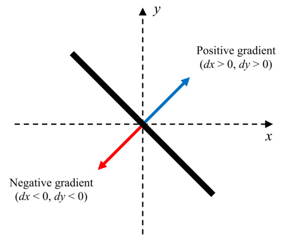 Specularity appears as radial lines centered on the camera position in the top-view image. This geometric property gives us a clue with which to distinguish between specular and non-specular pixels. The gradient vector of the possible specularity at a certain pixel can be calculated using the camera location. However, as shown in Figure 6, a straight line can have one of two gradient vectors: positive or negative. Therefore, one specular line can have either positive gradient or negative gradient vector according to the direction of intensity changes. To take this into account, we calculate the two gradient vectors, and , from the possible specularity direction at pixel . These two vectors are defined by following equations: