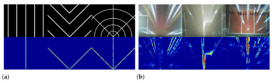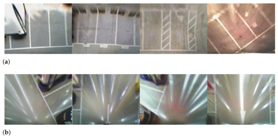 Perspective geometry of a camera causes planar surfaces such as a parking-lot floor to distort into peculiar shapes. Inverse perspective mapping [1] is a method to correct these irregularities that have been caused by factors such as lens distortion, and imaging geometry by employing an appropriate nonlinear mathematical model. Top-view images, also known as a bird’s-eye view images, generated using the inverse perspective mapping have been widely used in autonomous driving assistance system (ADAS) applications. Because the top-view image provides an elevated view of objects from above, users can easily recognize empty spaces or objects around the vehicle. In conjunction with line detection methods, the top-view images play an important role in line keeping and parking assistance systems. A line response map used for line detection is a filtered image to enhance line elements in the top-view image. To obtain the line response map, two approaches are generally used: edge filter-based [2,3,4,5,6,7,8,9,10] and line filter-based [11,12,13,14,15,16,17]. Both approaches generate the line response map by using the characteristics of a line with a convex intensity profile distinct from the background of the image. The line is then detected from the line response map using a random sample consensus (RANSAC) [8,9,11,12,17,18], Hough transform [3,4,5,6,7,16,19,20], or Radon transform [2,13]. The process described above has been successful in many line detection studies. However, the existing line detection methods produce false detection results when specular reflections are present on the ground, because the specular reflections in the image are similar to that of actual lines. As shown in Figure 1, specular regions generated by light sources form long straight lines. This phenomenon makes line detection very difficult, especially on glossy surfaces on which large bright specular regions form easily. Compounding the problem, some specular patterns produce stronger responses than actual lines in conventional detection methods, because they are much brighter than actual parking lines.