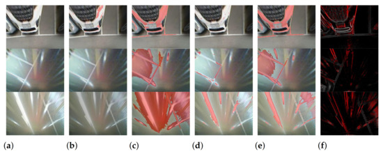 Results of qualitative evaluation for specularity detection: (a) raw image, (b) Morgand et al. [25], (c) Chang et al. [23]. (d) Li et al. [26], (e) Silva et al. [28], and (f) proposed.