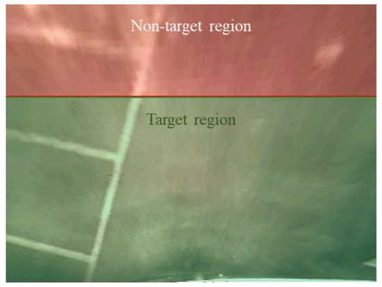 The two proposed methods focus on detecting elements caused by specularity in the intermediate output generated during the line detection process. The pixel-wise probability map provides probabilistic information for the edge of a specular region, and the line-segment-level estimation identifies specular line segments among detected line segments generated by the line detection. Since the goal of these two methods is not to estimate all specular regions, the performance of existing parking stall detection methods was measured by comparing junction detection results when the proposed specularity suppression methods were applied at the pre-processing stage, and when it was not. Let us define the junction as an intersection between a horizontal and vertical parking lines. Assume that we have detected a junction by using a parking stall detection method. Junctions located within a 10-pixel radius from the ground truth are considered to be positive, and all others are negative. Because the quality of top-view images degrades as the distance increases from the camera, we only consider junctions close to the camera in the performance evaluation. Junctions whose distance from the camera is less than 200 pixels in the y-axis are our main target (Figure 10). The well-known definitions of and are used as performance metrics. These measures are calculated as: