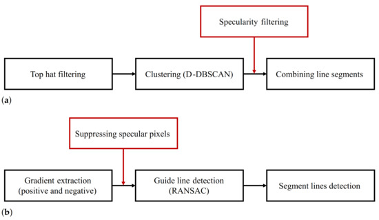 Flowcharts of (a) Lee’s method [15] and (b) Suhr’s method [8] with added specularity suppression and filtering. The black box is the original process, and the red box indicates the addition of our method.