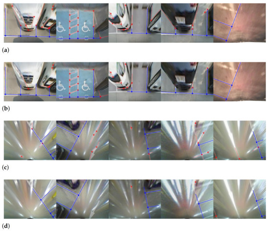 There was no improvement for recall, because Lee’s method finds all line segments in the top-view image. Lee’s method combines the line segments by considering geometric constraints. Then, the structural information containing a distance between adjacent junctions and each direction of line segments from a connected junction is used to detect parking stalls. In this algorithm, specularity filtering cannot help in finding missing true positives in line detection. However, it may be important for parking stall detection. Comparing the fifth column in Figure 12c,d, the enhanced version provides more distinguishable structural information about actual parking stalls; the approach implicitly assists in the estimation of parking stall structure.