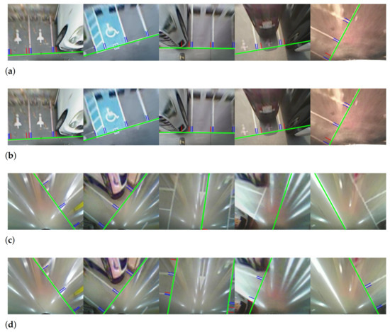 However, the recall of the enhanced version is almost same as that of the baseline in some indoor sequences. This phenomenon occurs because Suhr’s method locates parking stalls by sequentially detecting two types of lines: guide lines and segment lines. Suhr’s method first detects a guide line and then finds segment lines based on the detected guide line information. To detect the guide line, his method uses RANSAC and considers a line with the maximum inlier ratio to be a guide line. This scheme shows different performance according to the pattern of specularity. If specular pixels are widely scattered and form many short lines, the line response of the actual parking line is dominant over specularity. In this case, the baseline correctly detects the guide line, and recall is the same in both versions, as shown in first and second column of Figure 13c,d. The baseline has a very weak guide line detection performance for a specularity pattern in which specular pixels are densely gathered to form a strong straight line. The third to fifth columns of Figure 13c,d show the cases where the baseline fails to detect a correct guide line due to the strong specularity. The enhanced version therefore shows noticeably improved recall only in the 9 and 12 sequences captured from the environment in which long straight specularity is present.