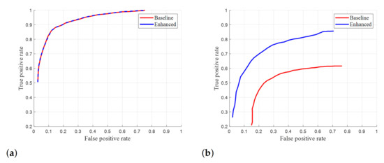 ROC curve comparison between the ’baseline’ and ’enhanced’ Suhr’s method [8] without and with the proposed method: (a) outdoor sequences and (b) indoor sequences.