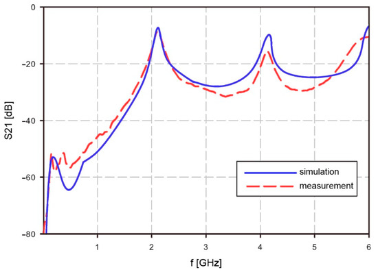 The measurement setup for S21 was as follows: Start frequency: 2 MHz, stop frequency: 6 GHz, resolution: 201 points, output power: high, interference rejection: off, system: Z0 50 Ohm, calibration: mechanical 2 port calibration.