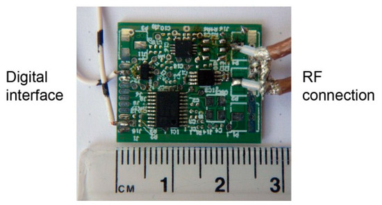 The complete module (except oscillator) for prototyping was realized on a small board, shown in Figure 6. The architecture shown in the block diagram in Figure 1 has a wide operating range and agile frequency adjustments. Such a wide operating range provides great flexibility. On the other hand, it takes some effort to control the device within the operating range after placing the device to the patient. First, the initial search is performed to find the resonant frequency. The frequency strongly depends on the position and the permeability of the surrounding tissue. In order to place it within the operating range of the microcontroller, the signal is transformed in two steps. In the first step it is divided by the frequency divider and in the following step it is subtracted by the DDS output frequency within the frequency mixer. In other words, the DDS output is adjusted to the frequency near the detected frequency of the resonator (divided via frequency divider). The DDS tracks the input frequency in discrete steps, which keeps the mixer resulting frequency within the detecting range of the microcontroller. The maximum detection frequency is limited by the microcontroller hardware, while the minimum detection frequency is limited by the stability of the mixer. The output can span down to DC (f = 0), but it is a common practice to avoid such a case due to additional difficulties that might occur, when the frequencies of both signals are very close. In our case, the lower limit was set to 10 MHz.