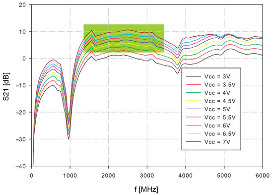 Firstly, the amplifier was tested. The S21 of the open loop oscillator amplifier was measured at different supply voltages (Figure 7). The reasonable gain margin for the oscillator is around 3–8 dB. Higher gains would result in increased phase noise and oscillator instability, which could have a consequence of possible spurious products. Lower gains than 3 dB might cause slower start, or even prevent oscillations. The useful frequency range is indicated in green.