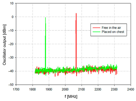 The oscillator output was measured with a spectrum analyzer. The spurious product within the measured spectra from 1800 MHz to 2300 MHz was negligible. The resonator was measured isolated from the tissue (red trace in Figure 8) and close to the tissue with the average relative permittivity of about 45 (green trace in Figure 8). The oscillator output frequency without load was 2078 MHz, which is very close to the simulated and theoretically designed 2101 MHz.