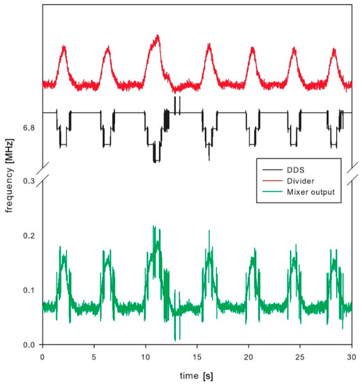The output signals from the frequency divider and DDS synthesizer are fed to the mixer. It is used to provide frequency translation. The result of the down-conversion is a low-frequency signal. The frequency of the mixer output signal is within the acceptable range for the microcontroller. The signal from the frequency divider shown in the block diagram (Figure 1) is a sine wave at frequency fR. It is mixed (multiplied) with the sine wave signal from DDS at frequency fD.