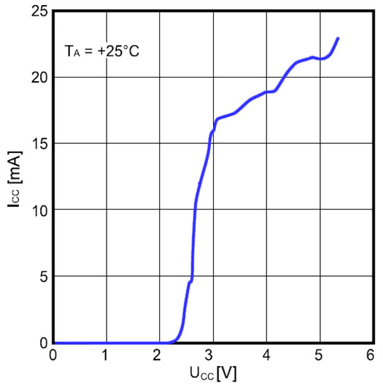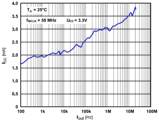 When switched on, the DDS generator is in its initial state. The DDS output is deactivated for 0.7 µs until its registers are set to the required state that determines the DDS output frequency. The DDS generator remains idle for eight oscillator frequency cycles (i.e., 1.78 µs at 50 MHz frequency). The DDS generator is thus ready for operation after 2.5 µs. Power consumption of DDS generator depends on its output frequency. Measured power consumption for different output frequencies at VCC equal to 3.3 V is shown in Figure 11. Assessed average power consumption at VCC = 3.3 V and ICC = 3.5 mA is 12 mW.