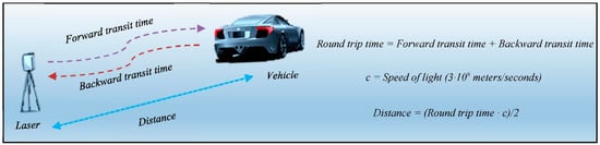 These sensors are based on light detection and ranging technology (LIDAR) for vehicle detection and classification [10,11]. Their operation is straightforward. Firstly, the laser emits multiple pulses of infrared light, which bounce off the vehicle and return to it. Secondly, the system measures the phase shift (angular or temporal, depending on the model) between the reflected and the emitted beams. Finally, the information is processed to obtain all kinds of characteristics of the vehicle [12,13,14]. Its mode of operation is shown in Figure 1.