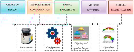 Although this may be a bit less economical, it offers much more information, precision, and durability than other systems, which is compensated and amortized over time. Therefore, as the realization of a new system for the detection, information extraction, and classification of vehicles in real time through laser technology requires a certain methodology for its development, this paper aims to be a guide to understand and know how to properly configure road sensor systems based on LIDAR technology. Figure 3 shows the entire procedure to configure a laser system correctly in detail.