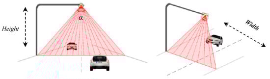 A laser system is based on an area detector, which is a device that works by measuring the flight time of a laser beam, as shown in Figure 1. A pulsed laser diode emits a beam toward the detection zone, in this case, the road, and its diffuse reflection is recorded by the receiver. According to the nomenclature used in Figure 1, forward transit time corresponds to the time it takes for the laser beam to reach the vehicle, while backward transit time corresponds to the time it takes for the laser beam to be captured again by the laser system once it bounces off the vehicle. In telecommunications, the sum of these parameters corresponds to the round-trip time: the amount of time it takes for a signal to be sent plus the amount of time it takes for an acknowledgment of that signal to be received. In this way, as these are directly proportional to the distance between the sensor and the vehicle, the distance is determined by measuring the time between sending the beam and detecting the reflection. Thus, knowing the distance to the road in the absence of vehicles, the height of vehicles that pass through the detection zone of the system can be obtained. Figure 4 shows the detection zone of a conventional two-lane highway. The scanning angle α means the total spread at which the scan is carried out, which is determined by the width of the road and the height at which the sensor is installed. The result of this process is a dataset in the form of a point cloud containing the position of every detection point.