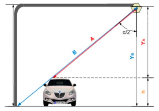 First, an initial scan in the absence of vehicles is made, which generates a reference or offset vector. This reference vector is basically the laser distance to each point on the road when there are no vehicles (measure B in Figure 5). However, each of these distances is measured with a determined scanning angle. Thus, it is necessary to know the angle that corresponds to each of the measurements when calculating the height values. In this way, the values of the heights of each of the points (YB) can be obtained by multiplying the value of B by the cosine of the corresponding angle α. Under ideal conditions, all the values of this vector should be the same, but sometimes, they may differ due to irregularities in the asphalt or static objects located on the road. Nevertheless, these vectors are stored in the equipment configuration and can be measured again if required.