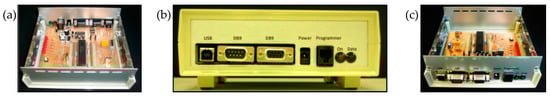 Once the hardware architecture specification stage was successfully completed, which implied the study of the principle of operation of laser scanner sensors, the establishment of the communication stages between the sensor equipment and the computer, and the design of the necessary hardware, the final PCB was placed inside a box as shown in Figure 8.