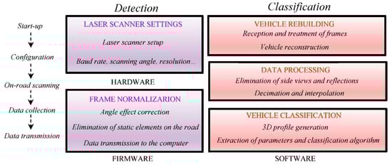 A microprocessor is used to acquire and process the signal prior to sending it to the computer. To avoid sending irrelevant information to this (when there are no vehicles on the road), it only sends signals when these are detected. In this way, during long periods in which there is practically no traffic, such as at night, the information channel is not saturated with irrelevant data. However, the microprocessor is also in charge of performing the following functions: adaptation and prior conditioning of the system depending on the selected laser, configuration of the laser scanner characteristics, and normalization of the laser plot (correction of the angle effect, detection and elimination of static elements on the road and sending information to the computer).