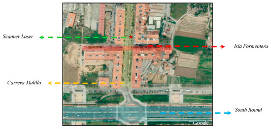 The site selected for installation was the junction of the Carrera Malilla and Isla Formentera street (Valencia 46026) in the southern part of the city. After the urban growth that formed the south round, this became the main exit from the neighborhood, which ensured a high flow of vehicles. Figure 10 shows the satellite view of the area, where the star indicates the location of the pole on which the scanner laser sensor was installed.