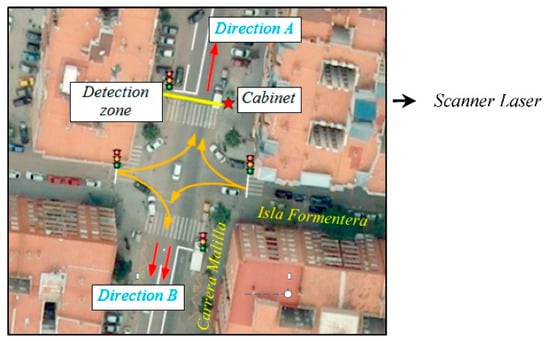 In the detection zone, two lanes were controlled in each direction as Figure 11 shows. Direction A referred to vehicles entering the neighborhood, while address B represented vehicles leaving it. In addition, as the zone was an intersection between a main road (Carrera Malilla) and a secondary one (Isla Formentera), the green phases of the traffic light were longer on the main road, giving priority to this.