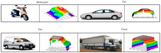 Experiments and tests were carried out for more than a year over three different periods. Early in the morning (between 8:00 and 11:30 am, when the light conditions on the road provided low light intensity), at midday (between 12:00 and 2:00 p.m., when the light intensity increased as it fell directly on the road) and at dusk (between 9:00 and 10:00 p.m., when the atmospheric light intensity was practically nil). In this way, this long period of time made it possible to carry out tests at all times of the year, which verified that the detection and classification were not affected in any case by the season of the year, luminosity or temperature differences. This verification was carried out by analyzing different captures and comparing them with the corresponding images taken by the camera, which ensured that the classification was accurate. Figure 12 shows some of the 3D profiles registered by the system after the passage of different vehicles on the laser sensor.