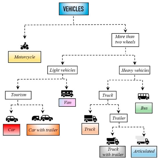 - It must discriminate up to 8 + 1 vehicle categories according to the classification of the German TLS standard defined by the Federal Institute for Highway Research (Bundesanstalt für Straßenwesen) [20], which has been taken as a reference in much of the world. It includes 8 vehicle categories (motorcycles, cars, cars with trailer, van, trucks, trucks with trailer, bus, and articulated vehicles) and the category “unknown”. Hence the 8 + 1 nomenclature.