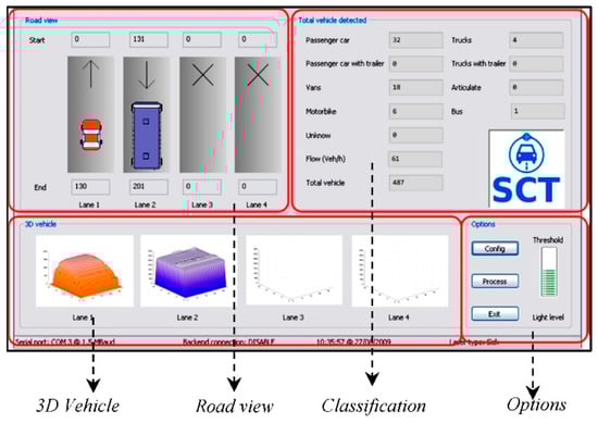 After defining certain guidelines and patterns based on these statistical analyzes, a classification was achieved using tree techniques according to the aforementioned German TLS standard (8 + 1 vehicle categories). Figure 13 shows the classification offered by the software. Furthermore, the system was designed so that these results can be sent to traffic management centers in real time using any type of communication technology: fiber optic cable, coaxial cable, GPRS, GSM, WiFi, or WiMAX. In fact, during field tests in Malilla, WiMAX technology was used to communicate with the Valencia City Council traffic control room from the system site. Figure 14 shows the graphical user interface of our system at the described location and the Supporting File ‘Functioning 1’, which describes how it works in real time.