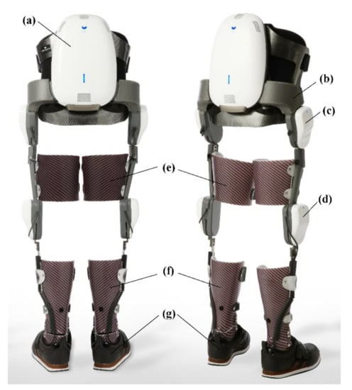 The powered exoskeleton used in the clinical experiments. (a) A controller back-pack including a battery, (b) a pelvic frame that rigidly supports the backpack and connects two hip joint actuators, (c) hip joint actuators, (d) knee joint actuators, (e) thigh bands, (f) ankle-foot-orthosis, and (g) shoes. The ground contact sensors are installed under the sole of the ankle-foot-orthosis.