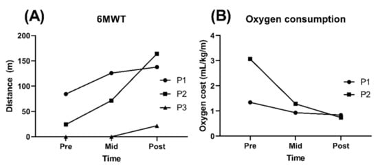 Changes in the 6-min walking test (6MWT) (A) and oxygen consumption (B) in children with CP through before, after 8 sessions, and at the end of robot-assisted gait training (RAGT). In the 6MWT, participant P1 walked with no device, participant P2 walked with bilateral crutches, and participant P3 used a platform walker. The oxygen cost was measured during the 6MWT. Participant P3 did not perform the oxygen consumption test due to complaints of discomfort with the mask while walking.