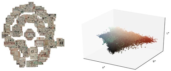 Left: Dunhuang dataset visualized in a two dimensional space with Barnes-Hut Stochastic Neighbour Embedding (BH-SNE) [8]. The clustering is done based on the activations of the first fully connected layer of the pretrained VGG19 network [9] that outputs a vector of 4096 features (color, size, semantics, etc.) for each image. Images are displayed exactly at their embedded location in the two-dimensional (2D) projection space. Right: color gamut of the Dunhuang dataset. The L*a*b* coordinates are rendered with the corresponding RGB colour.