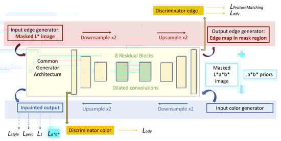 Both color and edge generators have the same underlying convolutional architecture, composed of encoder–decoder blocks and eight residual blocks with dilated convolution in between. Different from [17], we introduce the loss for the color generator to lower the bias towards mean values of the dataset’s gamut.