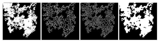 The performance of learned image completion is influenced by the network activations and the receptive field, especially when training for a resolution twice or four times the test image resolution. Based on this insight, we take the following measures to modulate the size of the receptive field: we incorporate dilated convolutions and we use irregular masks of different size and orientations. We start with a mask that simulates a random walk: starting from a random seeding position, each next move is decided by a random choice between the pixels in the four-connected neighbourhood. There can be multiple seeding positions and, at the same time, a pixel can be re-traversed multiple times, which decides the overall spread of the mask. We use the convention 1 values for holes, 0 values for non-hole region. Each base random walk mask is then further processed into morphological derivates (see Figure 4) by applying the following operations: dilation, skeletonization and medial axis transform. The random walk mask was proposed in the Dunhuang challenge [2,3]. This pattern was adopted in [22], where the authors call the normal random-walk dusk-mask and the dilated random walk jelly mask, claiming the former to be characteristic of mold and erosion and the latter of physical damages. Nonetheless, to the best of our knowledge, we are the first to introduce the skeletonization and medial axis transforms of the random walk. Through these operations, we are synthesizing a fine craquelure-like structure, a common aging effect of artworks.