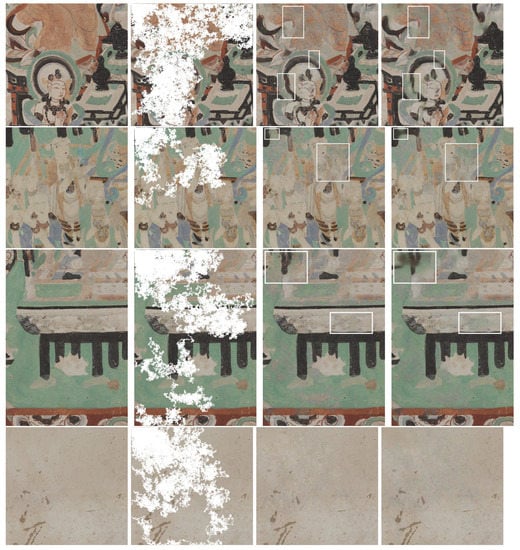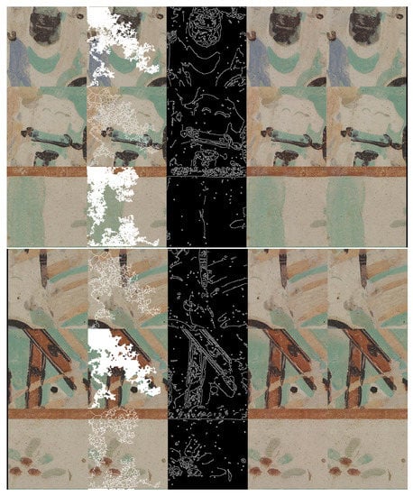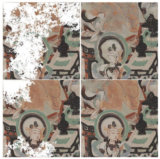 - Wang, H.L.; Han, P.H.; Chen, Y.M.; Chen, K.W.; Lin, X.; Lee, M.S.; Hung, Y.P. Dunhuang mural restoration using deep learning. In SIGGRAPH Asia 2018 Technical Briefs; Association for Computing Machinery: Tokyo, Japan, 2018; pp. 1–4. [Google Scholar] [CrossRef]